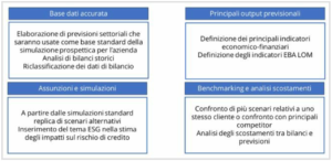 La valutazione prospettica utilizza approcci che partono da assunzioni su scenari macroeconomici alternativi e attraverso algoritmi economici di trasmissione consentono di proiettare le prospettive e i risultati economico-finanziari delle imprese affidate. Tale analisi si basa su modelli statistici ed econometrici fondati su tecniche evolute di analisi avanzate dei rischi.